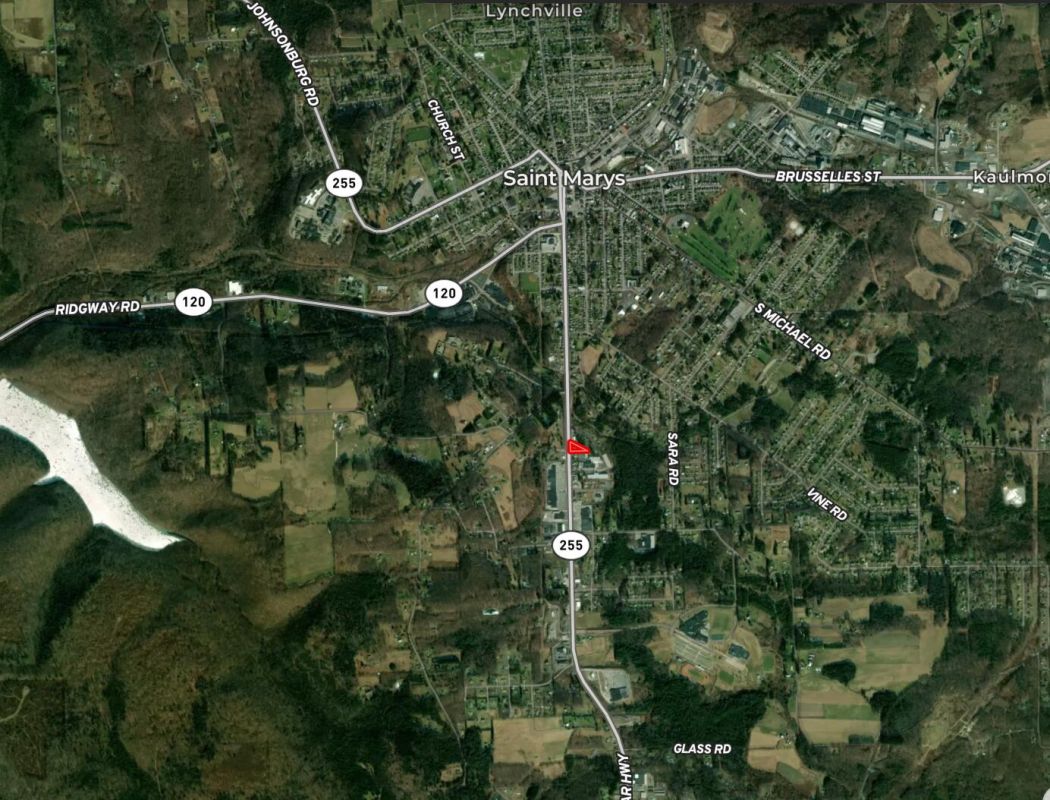 This is a great investment opportunity with a commercial building currently rented. The location on the East side of route 255 sets under a mile from the diamond in Saint Marys. The main building has large show room floors and two bathrooms, the attached garage storage area can allow for a multi use commercial business. The large pole barn in the back of the lot is used as storage. Call today toset up a showing on this rare offering in a great commercial location.
